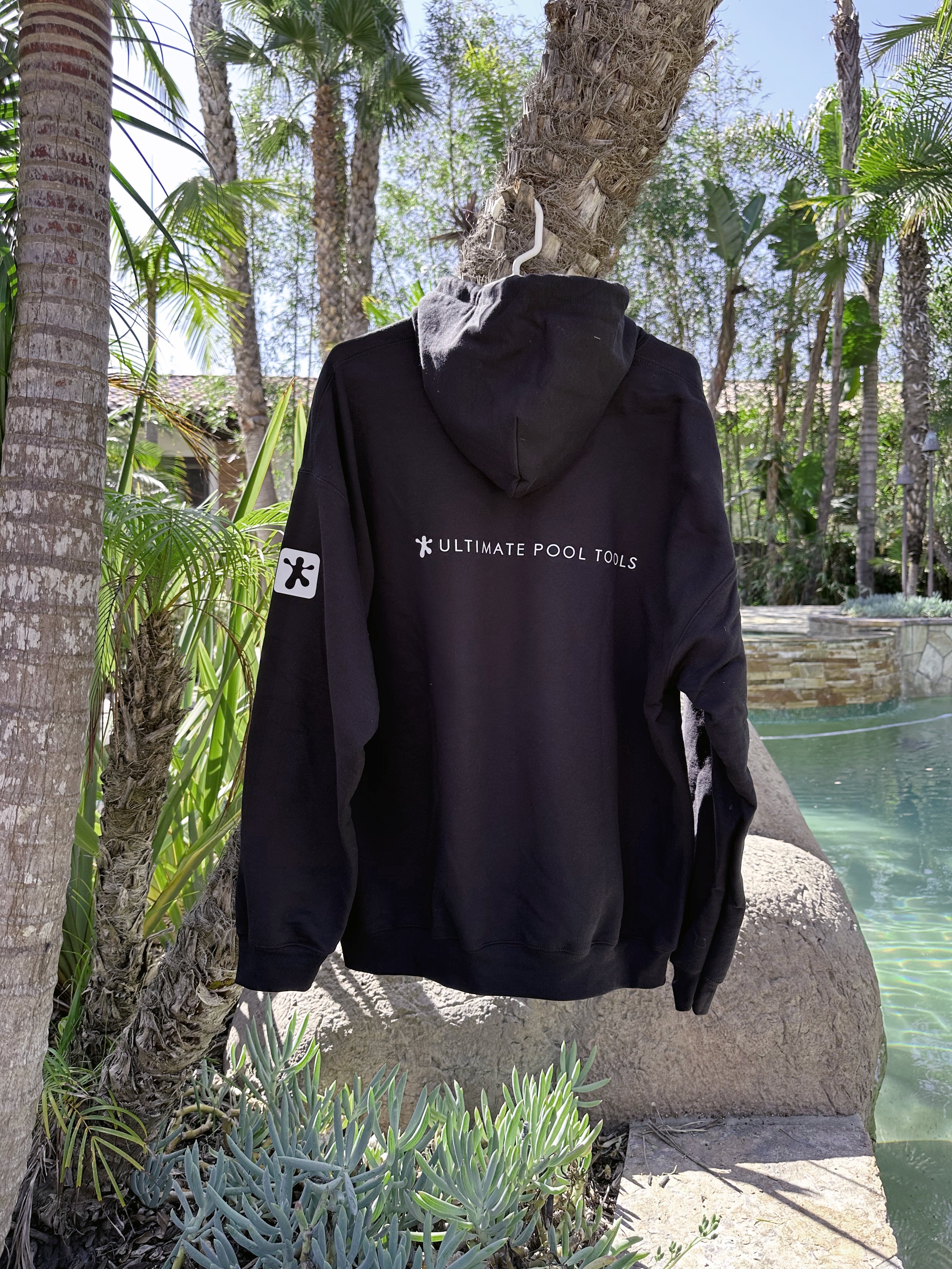 Unisex Hoodie, color black with front Ultimate Pool Tools logo front and back with right and left shoulder printing as well with front pocket.