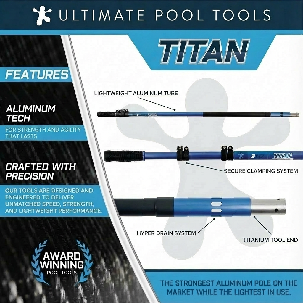 The 3X17 Titan Pole Telescopes from 7'5" to 17'8" This product is made out of 6063 aluminum material with a blue coating, featuring our patented HyperDrain TITANIUM tool end, and two right angle compression pinch clamps that allow for rapid length selection. MFG #: UPT-AT-3X17